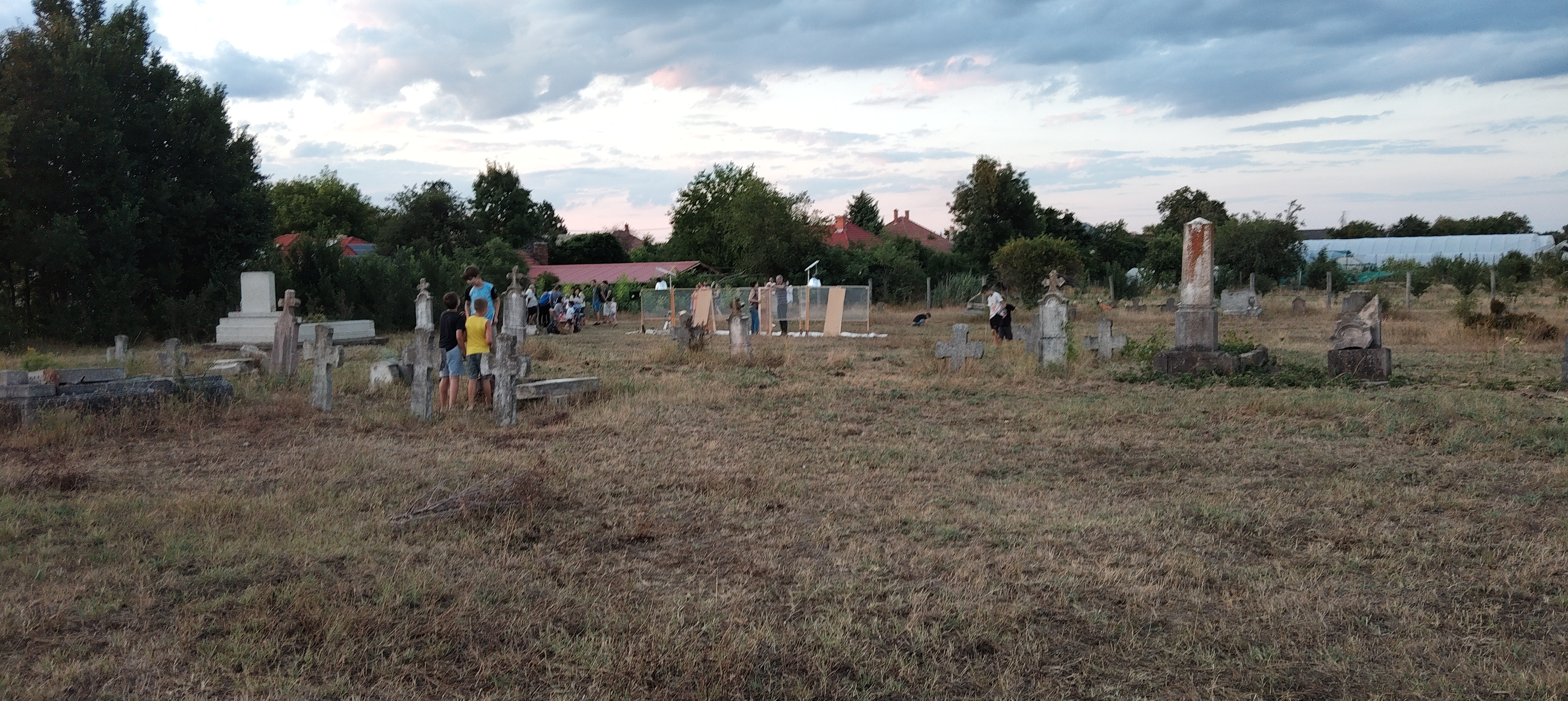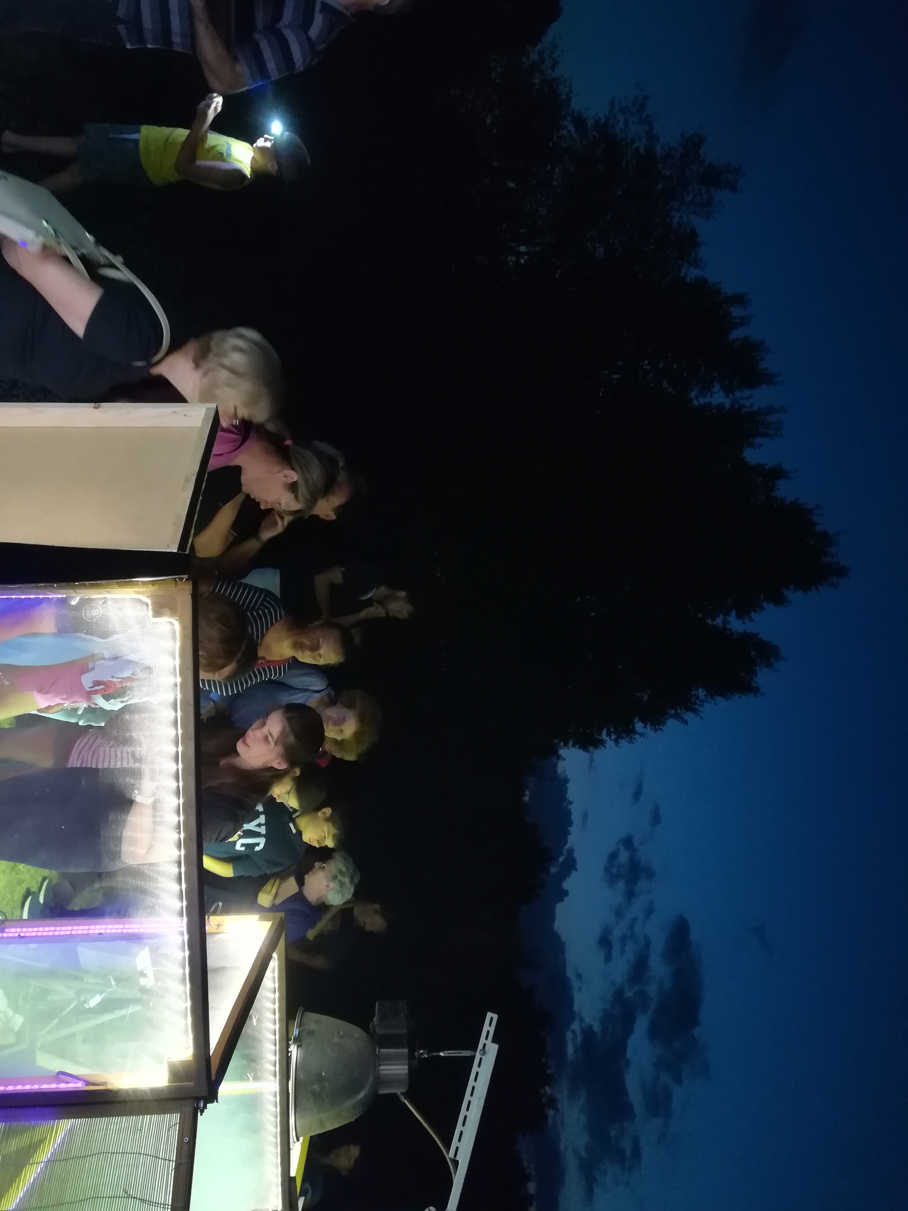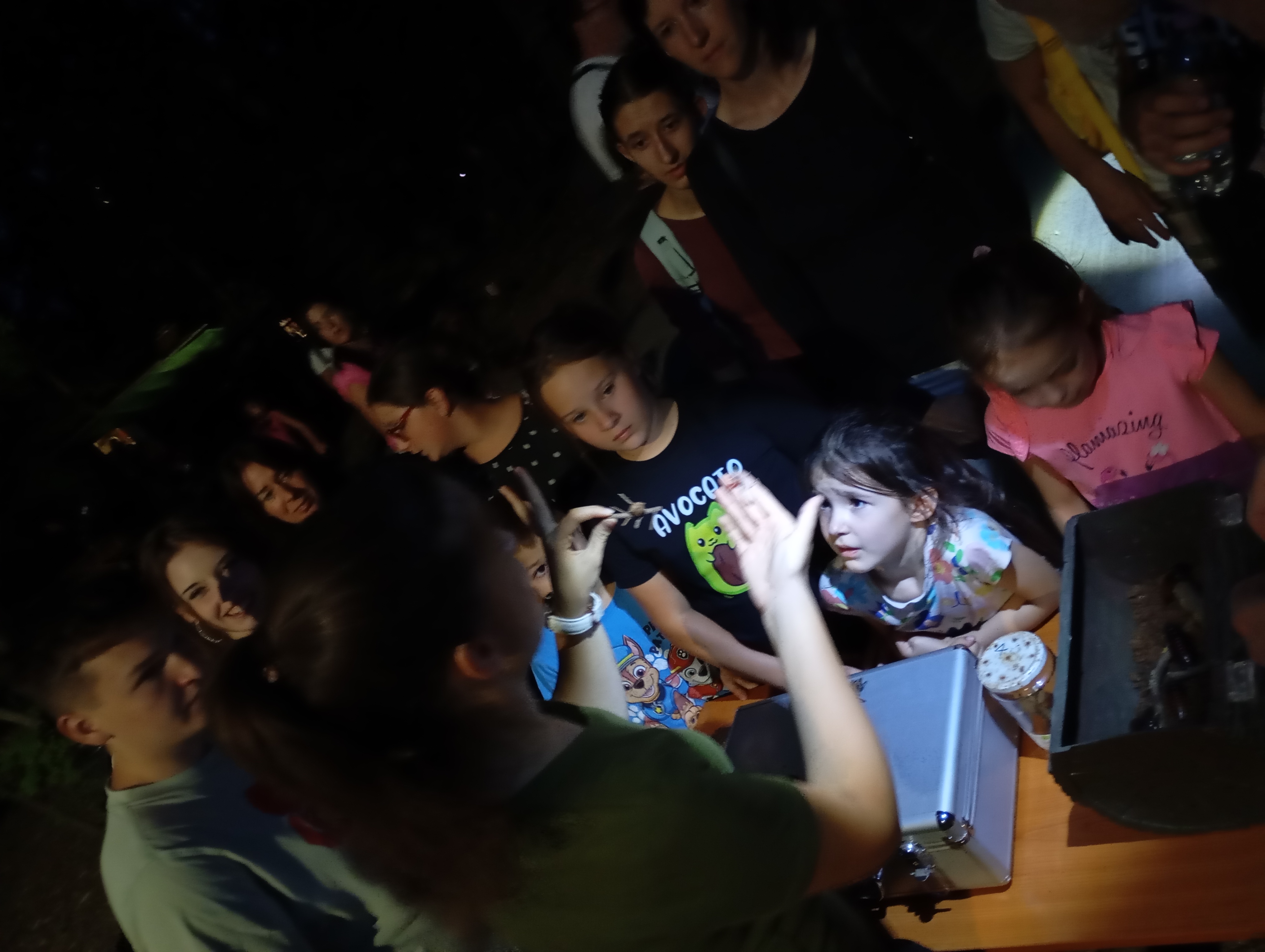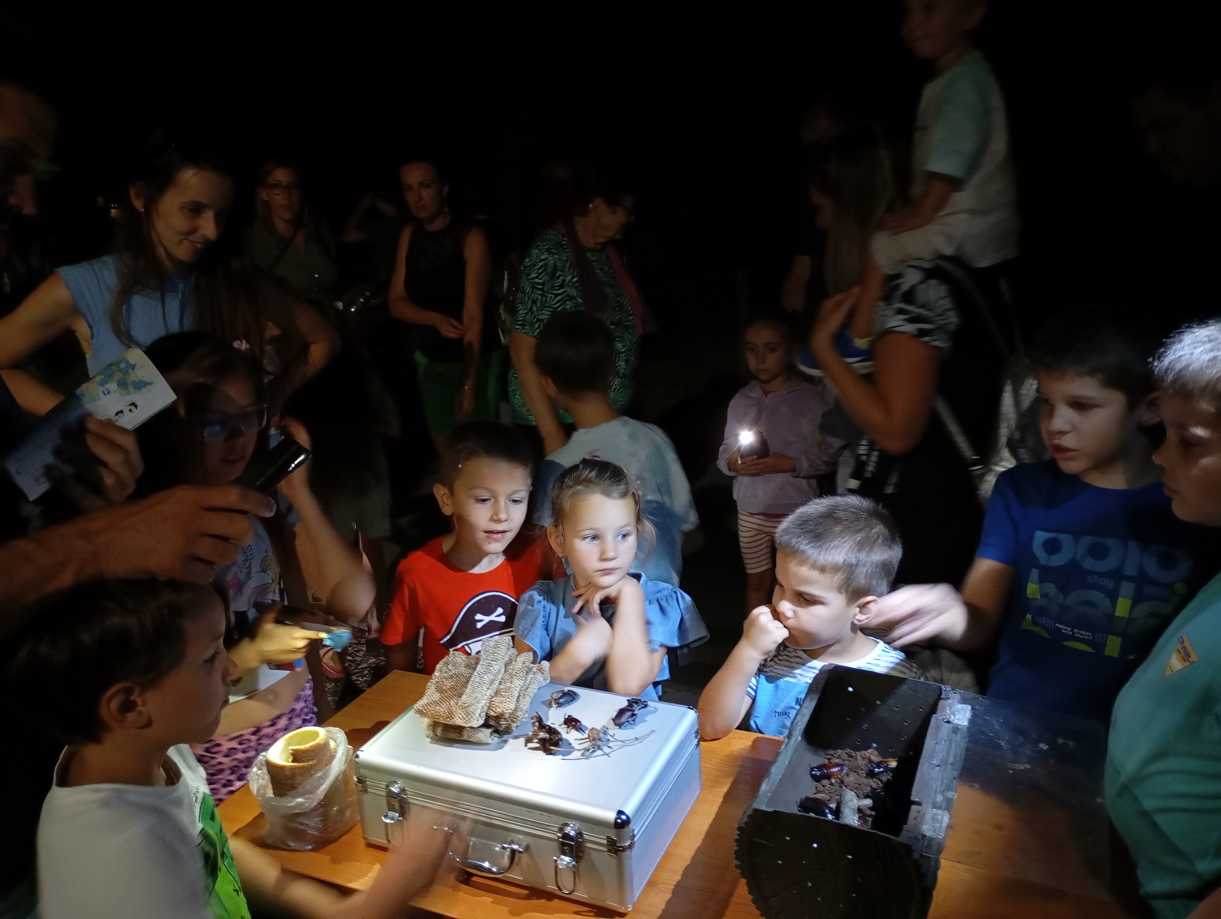 A gyerekek kimondottan élvezték a programot, mert már a sötétedés előtt ugráltak, futottak a fűben a pattogó sáskák, szöcskék után. Meglepően sok fiatal sisakos sáska (Acrida ungarica) volt jelen a réti- és olaszsáskákon (Calliptamus italicus) kívül a temető közepén található rövid fűvel borított tisztáson. A középpontba a szintén fiatal óriás ázsiai imádkozó sáska (Hierodula tenuidentata) került a látogatók nagy örömére. Ezen kívül közösen „gyönyörködhettünk” a zöld lombszöcske (Tettigonia viridissima) brutálisan nagy rágószájszervében, melyet nagyban, a monitor képén keresztül is meg lehetett figyelni. Voltak olyan bátor jelentkezők, akik meg merték fogni a lombszöcskét, sőt még a karjukra vagy a pólójukra is felengedték. Az este folyamán egy nőstény diófacincér (Aegosoma scabricorne) szintén tiszteletét tette a lámpafénynél. Nagy megdöbbenésünkre egy dunavirág (Ephoron virgo) is jött a fényre, bár sajnos szemtanúi voltunk röpke életének végső momentumainak, hiszen hasonlóan a tiszavirághoz, kifejlett állapotban nagyon rövid ideig élnek.