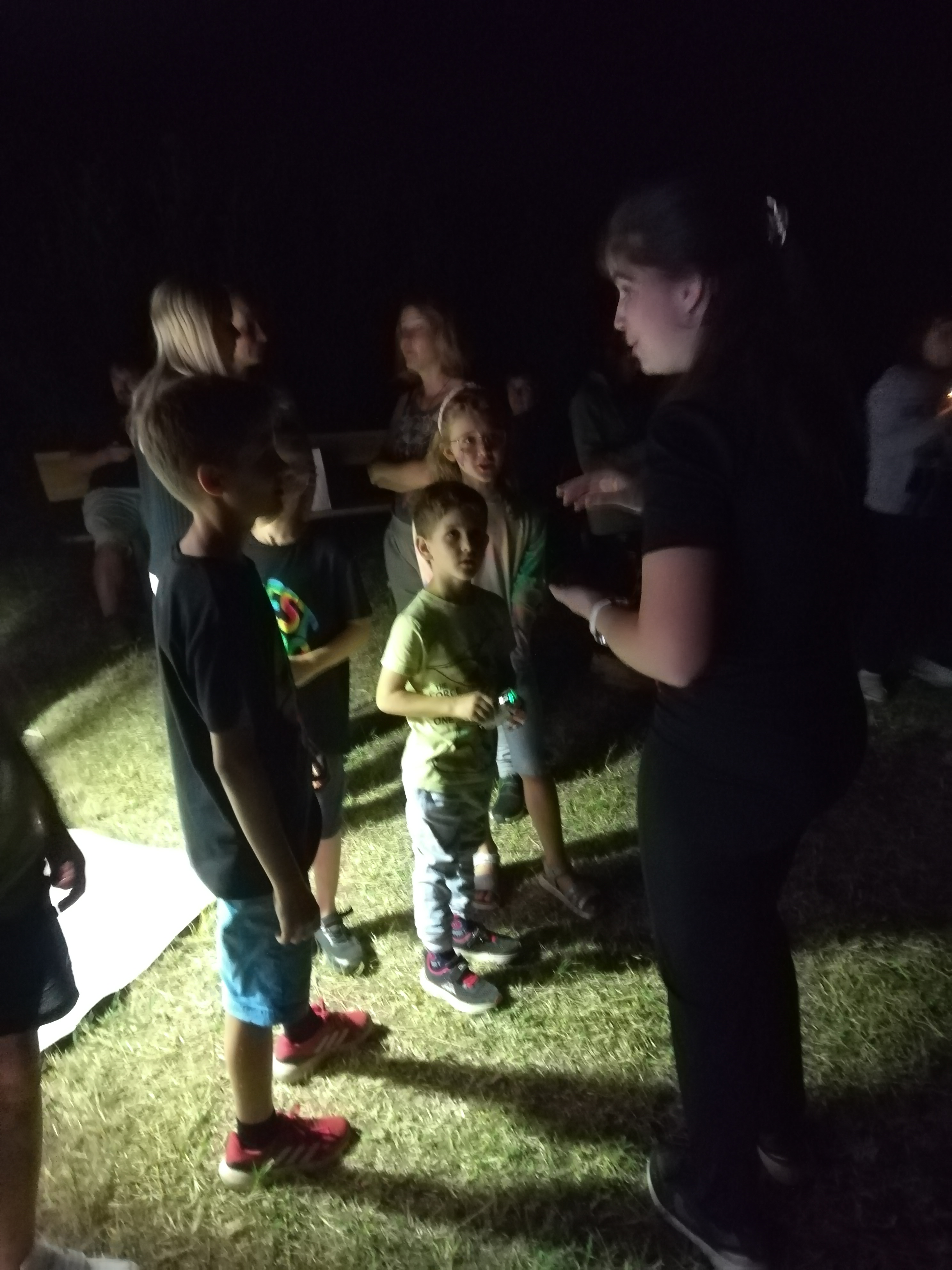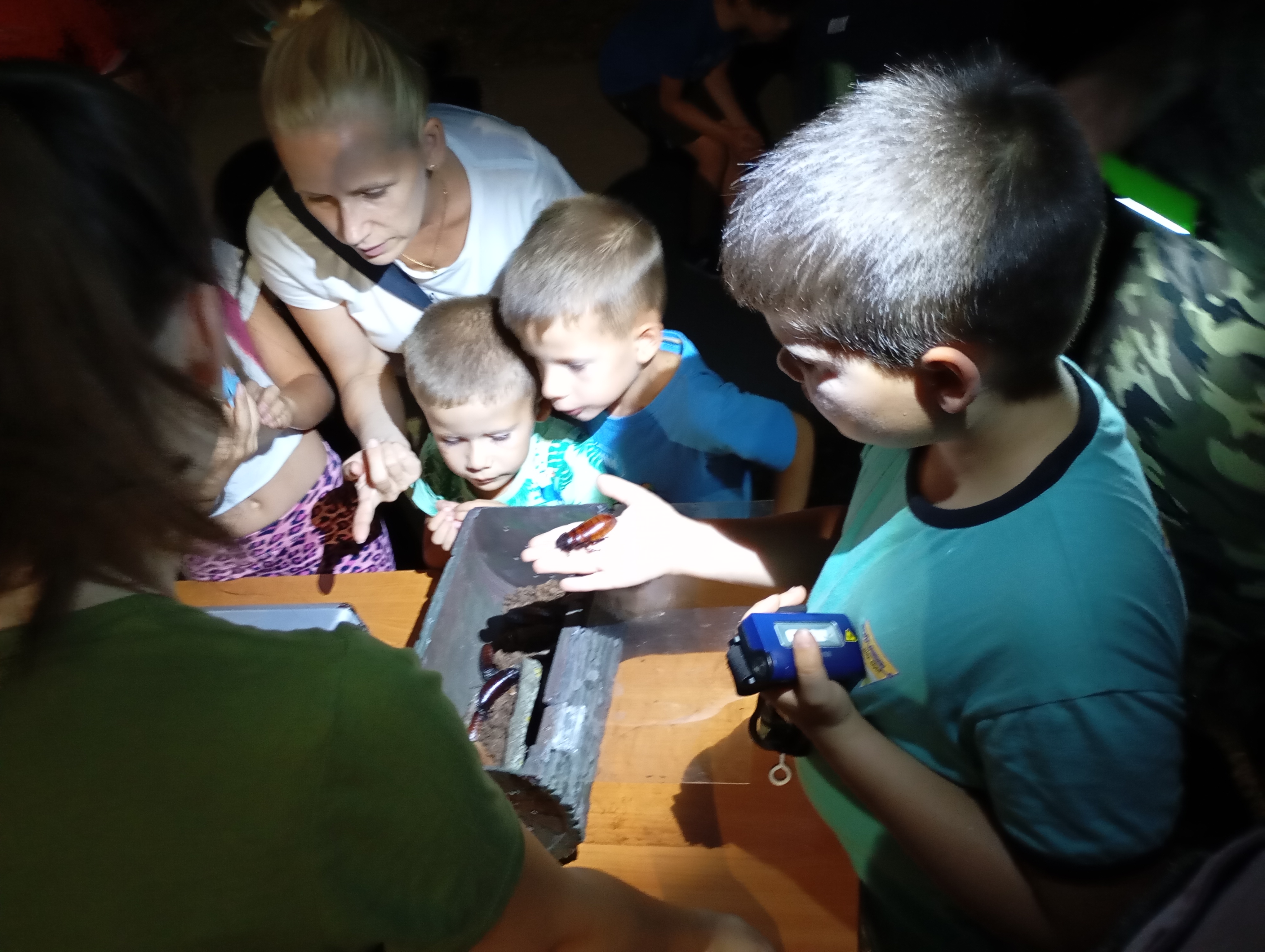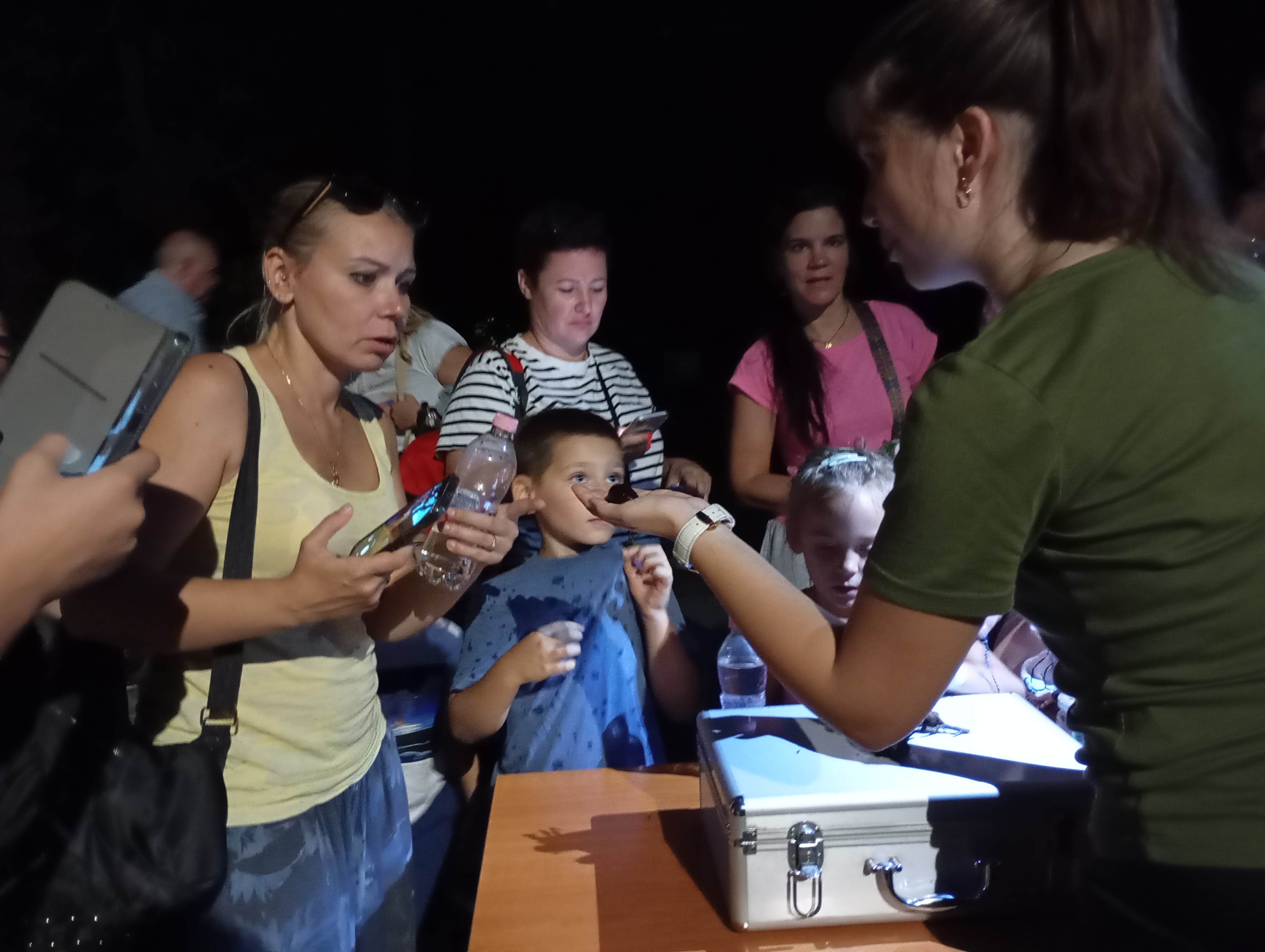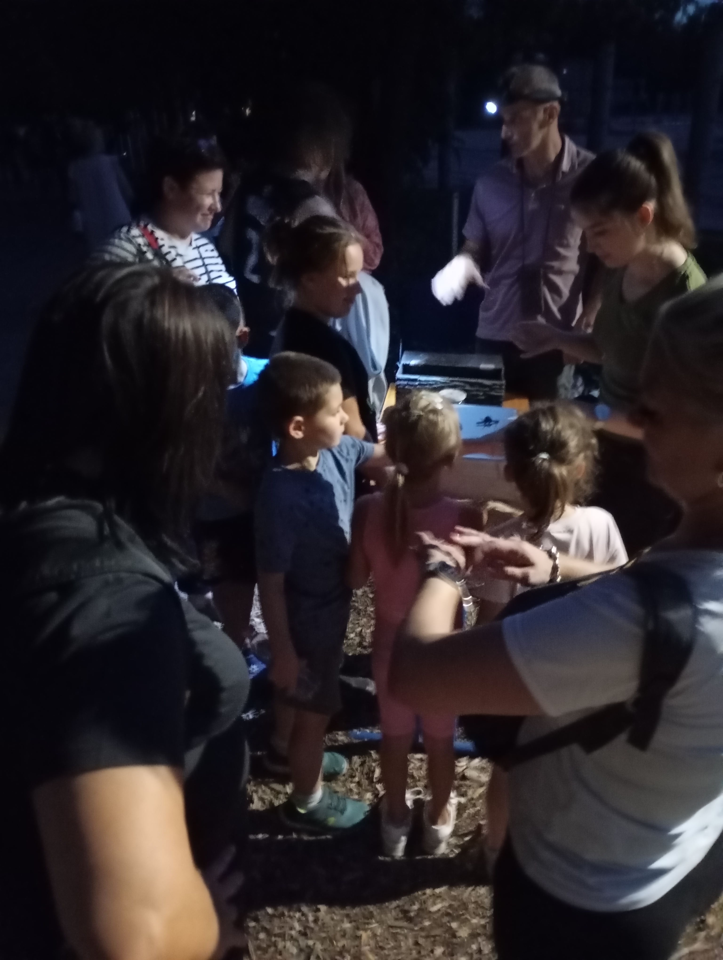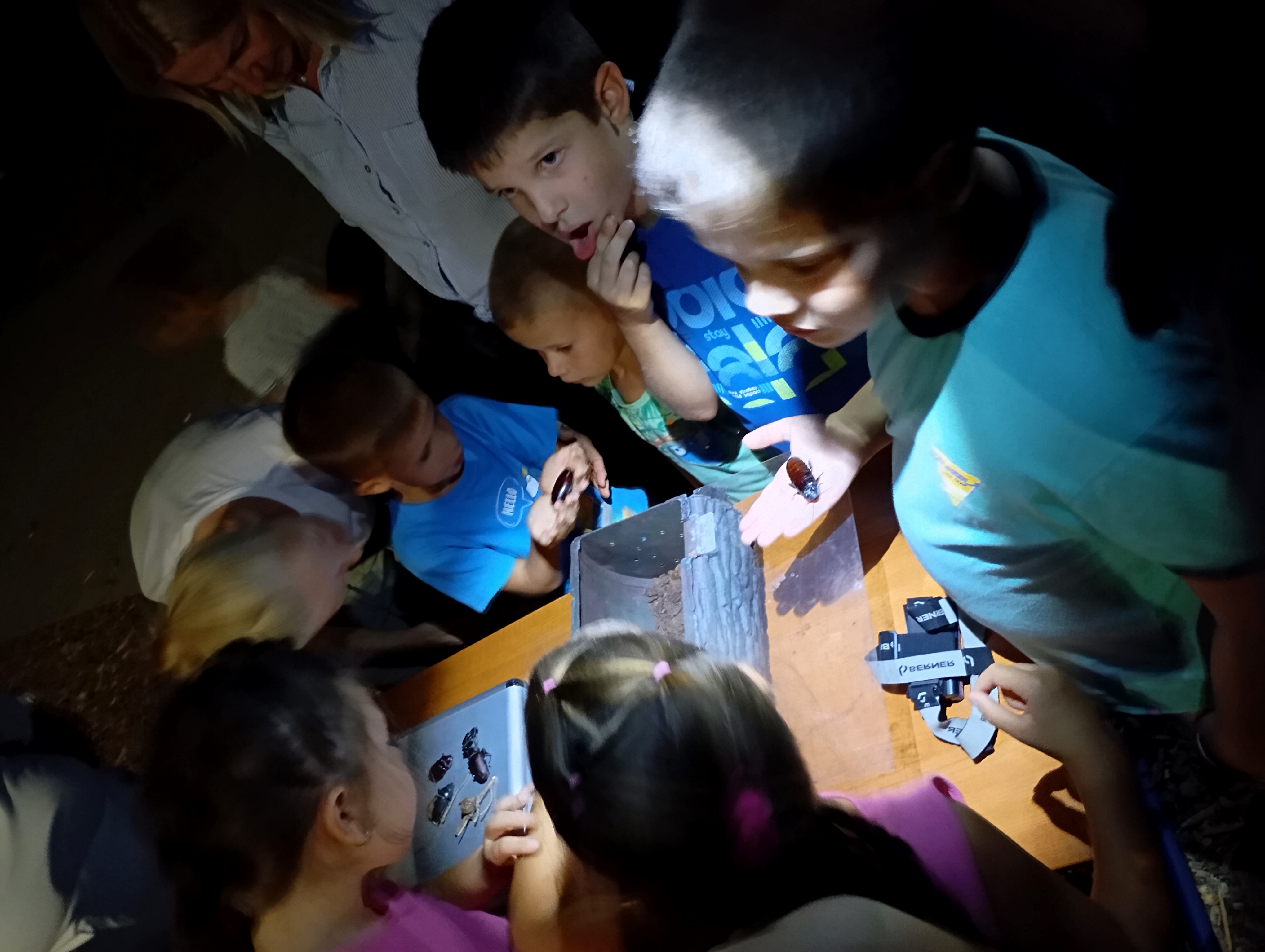 A gyerekek kimondottan élvezték a programot, mert már a sötétedés előtt ugráltak, futottak a fűben a pattogó sáskák, szöcskék után. Meglepően sok fiatal sisakos sáska (Acrida ungarica) volt jelen a réti- és olaszsáskákon (Calliptamus italicus) kívül a temető közepén található rövid fűvel borított tisztáson. A középpontba a szintén fiatal óriás ázsiai imádkozó sáska (Hierodula tenuidentata) került a látogatók nagy örömére. Ezen kívül közösen „gyönyörködhettünk” a zöld lombszöcske (Tettigonia viridissima) brutálisan nagy rágószájszervében, melyet nagyban, a monitor képén keresztül is meg lehetett figyelni. Voltak olyan bátor jelentkezők, akik meg merték fogni a lombszöcskét, sőt még a karjukra vagy a pólójukra is felengedték. Az este folyamán egy nőstény diófacincér (Aegosoma scabricorne) szintén tiszteletét tette a lámpafénynél. Nagy megdöbbenésünkre egy dunavirág (Ephoron virgo) is jött a fényre, bár sajnos szemtanúi voltunk röpke életének végső momentumainak, hiszen hasonlóan a tiszavirághoz, kifejlett állapotban nagyon rövid ideig élnek.