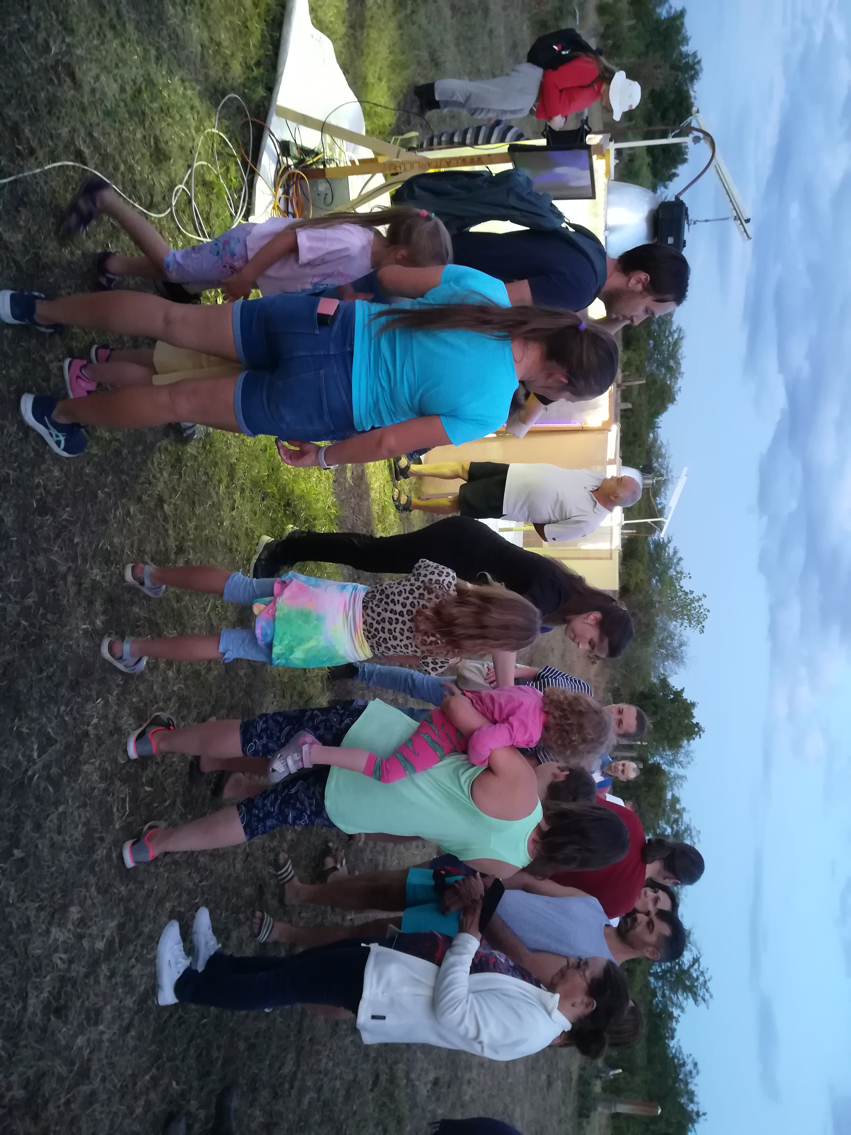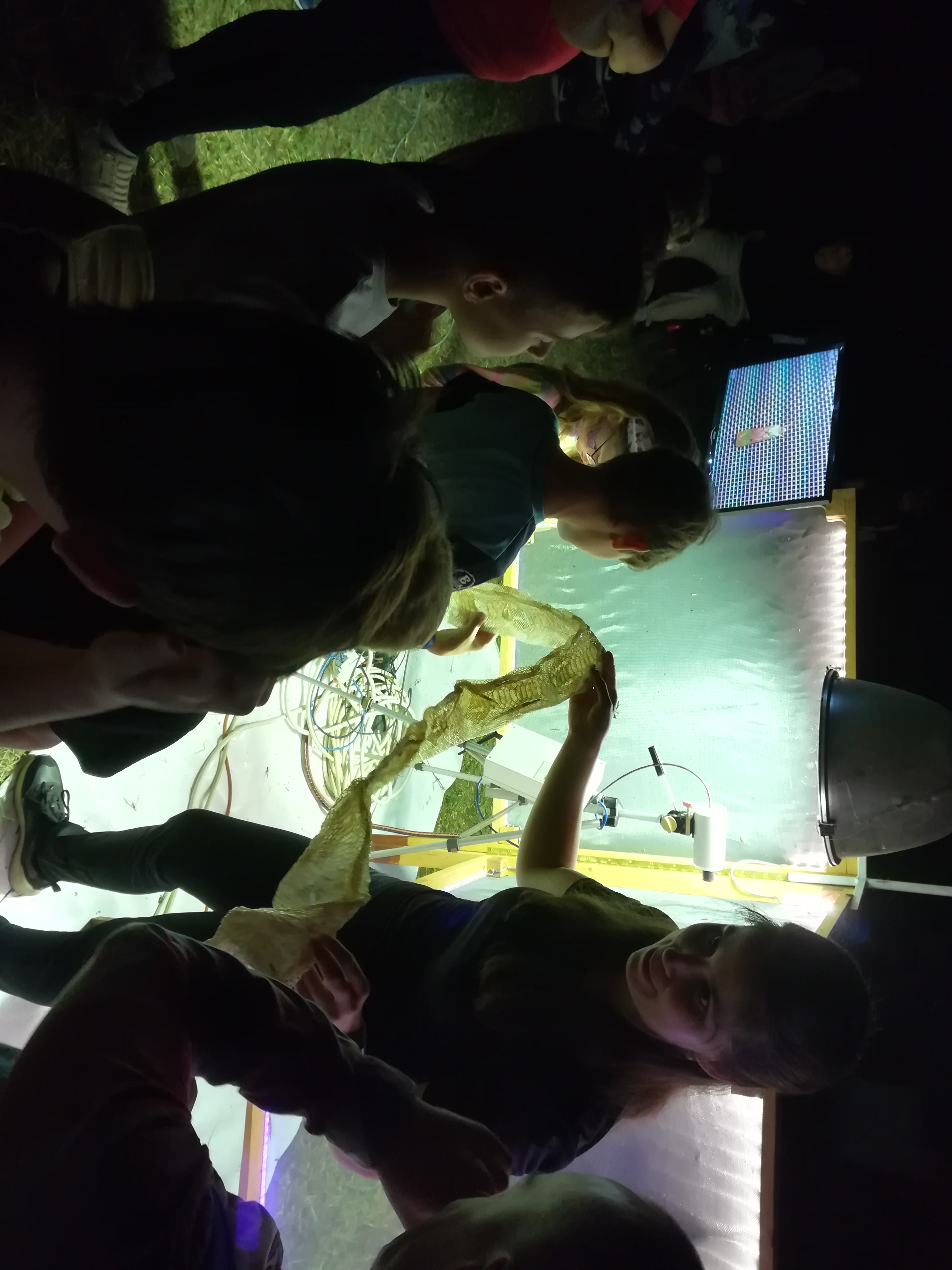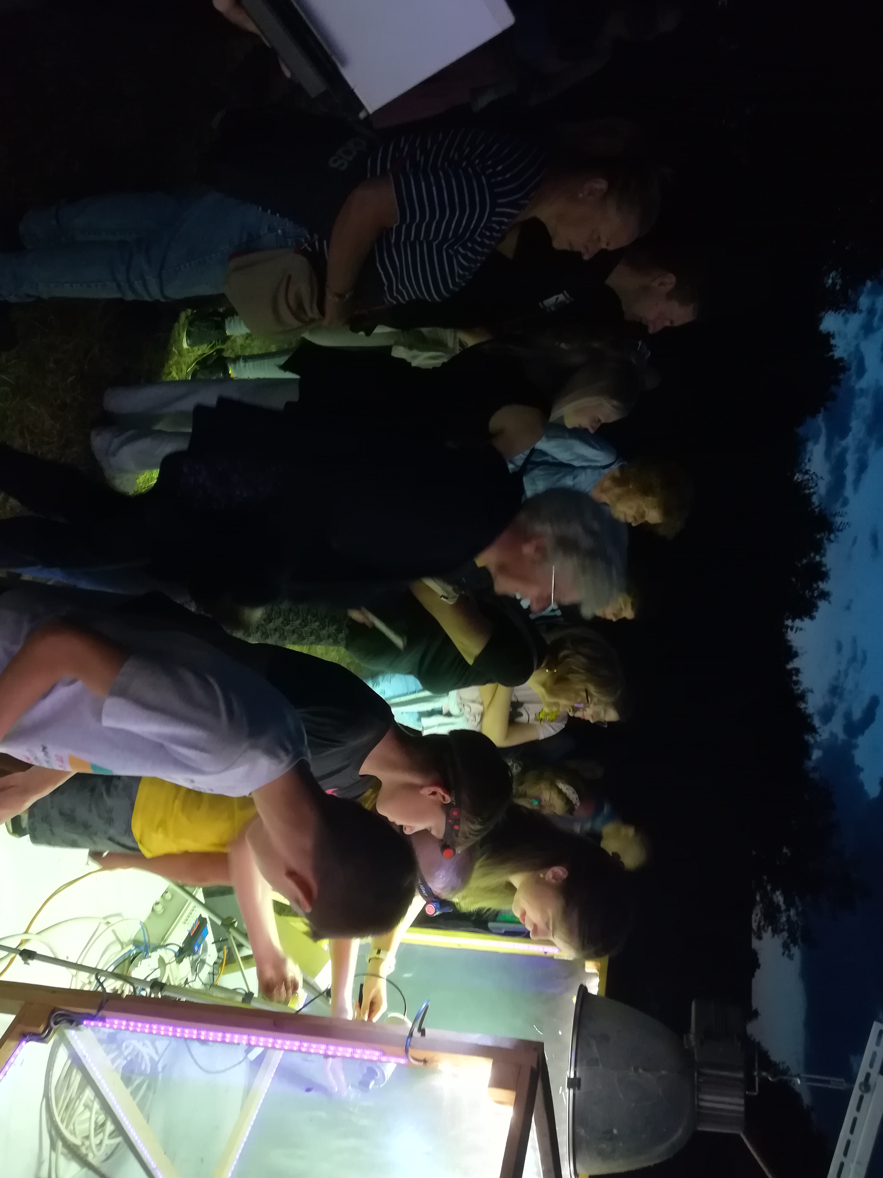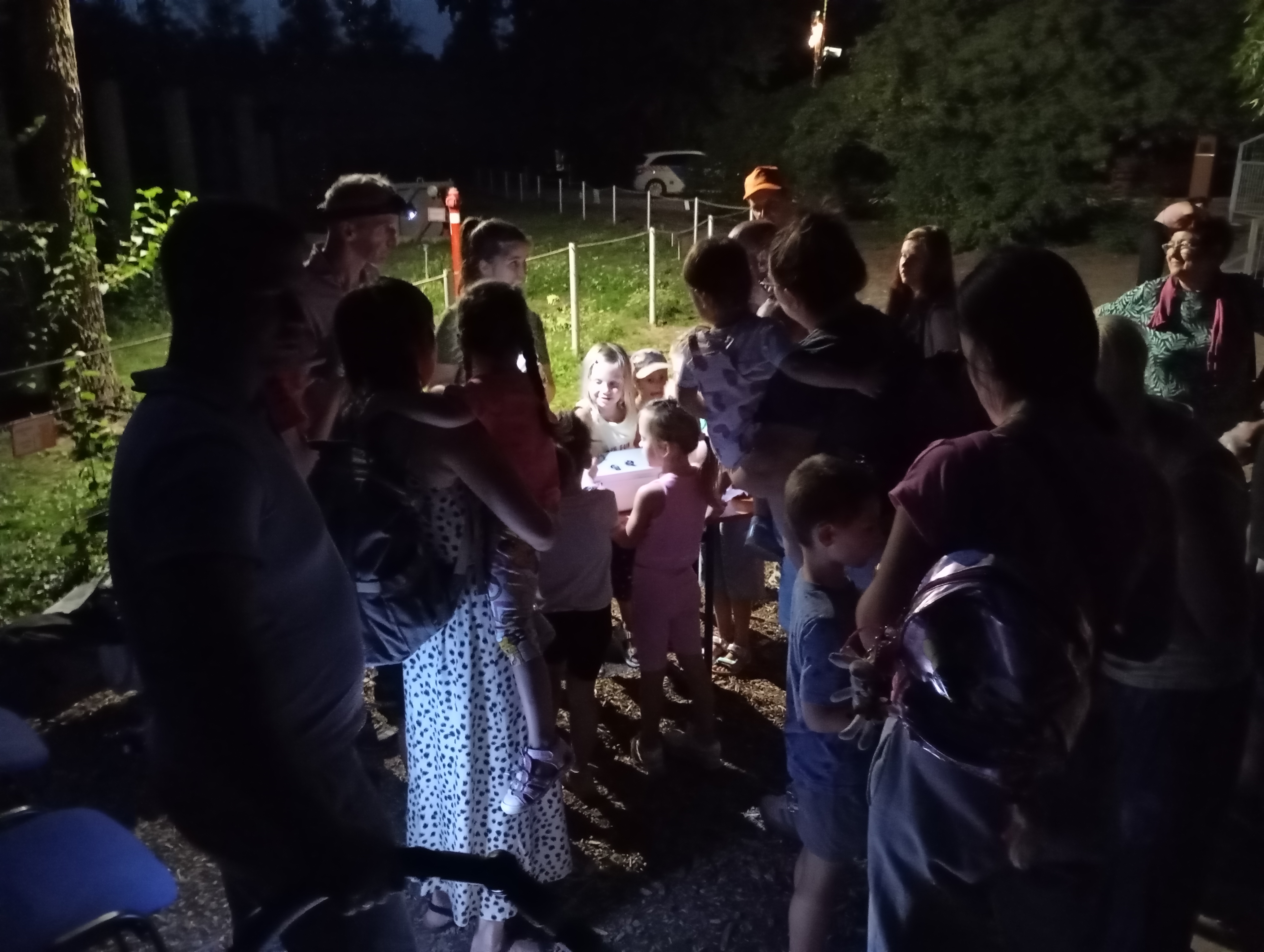 A gyerekek kimondottan élvezték a programot, mert már a sötétedés előtt ugráltak, futottak a fűben a pattogó sáskák, szöcskék után. Meglepően sok fiatal sisakos sáska (Acrida ungarica) volt jelen a réti- és olaszsáskákon (Calliptamus italicus) kívül a temető közepén található rövid fűvel borított tisztáson. A középpontba a szintén fiatal óriás ázsiai imádkozó sáska (Hierodula tenuidentata) került a látogatók nagy örömére. Ezen kívül közösen „gyönyörködhettünk” a zöld lombszöcske (Tettigonia viridissima) brutálisan nagy rágószájszervében, melyet nagyban, a monitor képén keresztül is meg lehetett figyelni. Voltak olyan bátor jelentkezők, akik meg merték fogni a lombszöcskét, sőt még a karjukra vagy a pólójukra is felengedték. Az este folyamán egy nőstény diófacincér (Aegosoma scabricorne) szintén tiszteletét tette a lámpafénynél. Nagy megdöbbenésünkre egy dunavirág (Ephoron virgo) is jött a fényre, bár sajnos szemtanúi voltunk röpke életének végső momentumainak, hiszen hasonlóan a tiszavirághoz, kifejlett állapotban nagyon rövid ideig élnek.